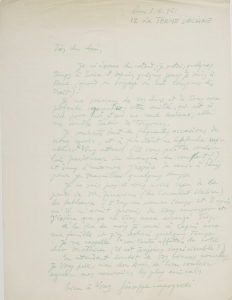 Rome 26 mars 1951. Remerciements pour l’envoi d’un bel article qu’il va faire publier dans la revue Spazio de Milan ; il espère bientôt aller à Paris « choyer ce trésor qui est le partage de votre précieuse amitié » et va lui envoyer des clichés de ses œuvres dont une de 1948, « une de mes dernières recherches dans le figuratif »... 1er juin. Il s’inquiète de l’envoi de tableaux. Il met son atelier à sa disposition et souhaite venir à Paris à l’automne « pour y travailler quelques temps »... 29 juillet. Il le remercie de vouloir monter une exposition sur lui, et de sa confiance en son travail, mais ne sait quoi faire pour Nina Dausset qui l’avait invité à exposer en novembre dans sa galerie : il ne veut pas avoir deux expositions en même temps. Il attend avec impatience « votre admirable édition du Manifeste Mystique de Dali », et regrette d’avoir manqué les expositions sur Dali, Michaux, et Giacometti. Il se félicite des succès de leur ami le peintre Georges Mathieu, etc. Milan 15 novembre 1952. Suite à des accords d’exclusivité, il le prie de tenir à la disposition du comte d’Arquian les œuvres qu’il lui avait remises en dépôt... Rome 17 juillet 1953. Mr Sweeney a retenu quelques toiles chez Cardarro à New York, et doit se décider ; il évoque une éventuelle exposition à Paris, et demande des nouvelles des toiles laissées en dépôt. Il espère voir Tapié à la Biennale de Venise... 7 mai 1954. Il a montré à Moretti la note de Tapié sur lui, qu’il trouve admirable : « je trouve que vous ne pouviez pas mieux définir l’essence de ma recherche »... 14 septembre 1956. Félicitations pour l’ouverture de la fondation italo-américaine, dont Tapié est conseiller artistique... 5 octobre. Il donne son accord pour une exposition en juin à Paris : « J’enverrai 2 tableaux un blanc et noir »... 4 novembre 1960, au sujet d’envoi de lithographies et de matériel lithographique, de la rédaction du catalogue et de « l’introduction à ma monographie » qu’écrit Tapié…. On joint une photographie, un télégramme et une affiche d’exposition à la Galeria di Spazio (Rome 1954).