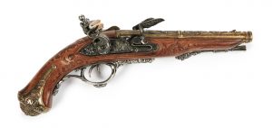 Réplique de pistolet à double canon à silex, double platine, canon à décor de trophées et palmettes marqué saint Etienne, crosse en noyer à décor gravé de rinceaux fleuris, culasse ornée du N couronné. Modèle 1806 Travail moderne Hauteur...