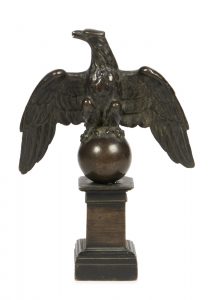 Aigle aux ailes déployées tête à gauche, les griffes reposant sur une sphère. Epreuve en bronze à patine brune, reposant sur un socle à section carré et à degrés. Fin XIXe siècle, début XXe siècle Hauteur : 17 cm - Largeur : 12,5 cm -...