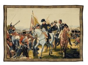 D'après Horace VERNET (1789-1863) La bataille de Friedland Tapisserie mécanique à bordure à fond noir ornée de palmettes en fil dorés. Au dos, étiquette Claye. Travail moderne, flamand Hauteur : 66 cm - Largeur : 94 cm