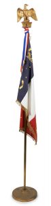 Etendard napoléonien composé de l'aigle impériale en bois et plâtre doré, monté sur hampe en métal avec drapeau à décor de broderies appliquées et abeilles. Fourni avec un socle de métal doré. Reproduction moderne. Hauteur : 215 cm (une...