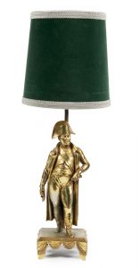 Lampe en régule à patine doré figurant Napoléon Ier en pied sur une terrasse rectangulaire à décor de draperie. Travail moderne. Hauteur : 43 cm - Largeur : 12,5 cm - Profondeur : 10,5 cm (Légères usures, bon état)