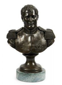 Buste figurant Napoléon en uniforme de général sur piédouche. Epreuve en bronze à patine brune, cachet de fondeur "Empire Collection" à l'arrière, sur un socle de marbre vert. Travail moderne. Hauteur : 33 cm - Largeur : 23 cm - Profondeur :...