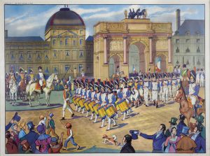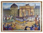 "Une revue militaire à Paris" Affiche scolaire tirage offset en couleurs, Tableau n°3 d'une série historique, éditions "La maison de l'instituteur" à Saint-Germain-en-Laye, impression Georges Lang à Paris Milieu du XX siècle Dans un cadre en...