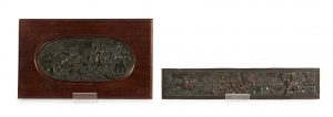 Bas-relief en cuivre à patine brune à l'imitation du bronze figurant trois scènes de batailles napoléoniennes entourées de frises perlées. XXe siècle Hauteur : 7 cm - Largeur : 33,5 cm (Usures à la patine) On y joint : Bas-relief en cuivre à...
