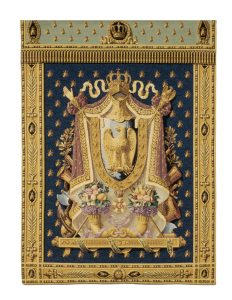 Tapisserie mécanique à fond bleu nuit à décor au centre de l'aigle impériale dans un écusson entouré de draperie , trophées, cornes d'abondance et attributs impériaux, semi d'abeilles. Bordure supérieur à fond bleu ciel animée d'abeilles,...