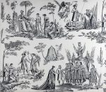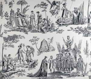 Deux échantillons de toile de Jouy imprimée en noir et blanc figurant des scènes de campagnes et allégorie sur le thème des victoires de Napoléon Ier. Contre-collés sur un panneau. XXe siècle Hauteur : 83 cm - Largeur : 95 cm (Quelques...
