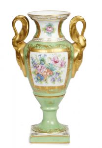 Vase en porcelaine à col évasé, anses col de cygne reposant sur une base carré, à décor polychrome et or sur fond vert de bouquets fleuris dans des médaillons en réserve. Marque dorée au revers. XXe siècle Hauteur : 27 cm - Largeur : 15 cm...