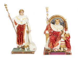 D'après Jacques Louis DAVID (1748-1825) Napoléon Ier en costume de sacre et Napoléon Ier sur le trône impérial. Deux sujets en résine polychrome, marqués @2011 et @2007 VERONESE. Hauteurs : 28 et 30 cm - Largeurs : 15 et 14,5 cm - Profondeur :...