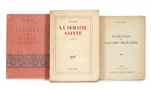 ARAGON (Louis) La semaine sainte. Collection NRF, Paris éditions Gallimard, 1959 Un volume broché, enrichi d'un émouvant envoi de l'auteur à Monsieur René Lefrançois. Etat moyen On y joint : - FORT (Paul) Florilège des Ballades Françaises....