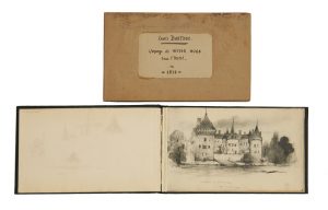 BARTHOU (Louis). Un Voyage romantique en 1836. Paris, H. Floury, 1920. Deux volumes de format oblong, l'un broché, l'autre sous la forme d'un carnet à dessin. Le carnet est un fac-similé de l'album de voyage original du voyage de Victor Hugo et...