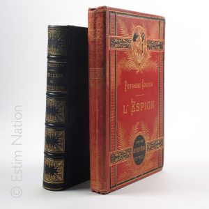 état 24,5 x 17 cm COOPER (Fenimore) L'espion, Tours, Alfred Mame et fils, éditeur, 1886 1 volume relié et illustré de 24 gravures d'après les dessins de Lançon, plats et dos en percaline rouge à décor estampé noir et or. Etat moyen 27,5 x 18 cm