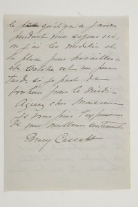 Mesnil-Beaufresne, 14 septembre [1913]. Elle le prie « de permettre la personne envoyée par la maison Durand-Ruel de prendre mon tableau chez vous. Je voudrais faire le peu qu’il y a à faire pendant mon séjour ici, où j’ai les modèles et la place pour travailler »…{CR} Villa Angeletto, Grasse 28 décembre 1913. « Je reçois des lettres me disant que votre livre est écrit d’un style charmant. Je n’ai pas reçu des articles de journaux dont vous me parlez. C’est si pénible pour moi de voir mon nom dans un journal. Mais j’espère que le livre aura du succès après la peine que vous vous êtes donné. Nous avons eu un temps radieux ici, et avec le soleil qui nous a tant manqué cet été »…