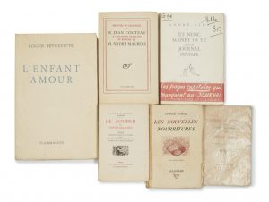 l'auteur. - BERNAGE (Berthe) Brigitte, Femme de France, Paris, éditions Gautier-Languereau, 1948, enrichi d'un envoi autographe ed l'auteur. - PEYREFITTE (Roger) L'enfant amour, Flammarion, 1969, exemplaire numéroté avec envoi autographe signé et daté de l'auteur. - CAIJHAVA DE L'ESTENDOUX, Le souper des petits-maîtres, Collection le coffret du bibliophile illustré, Paris Le livre du bibliophile, illustré - LOVENJOUL (Charles de) Alfred de Musset et ses prétendues attaques contre Victor Hugo, Paris, Edouard Rouveyre, 1878 - GIDE ( André) Les nouvelles nourritures, Gallimard NRF - GIDE (André) Et nunc manet in te, éditions Ides et Calendes - Discours de réception de Jean Cocteau à l'Académie française et réponse de André Maurois, éditions NRF Gallimard, deux volumes - Mémoires de Madame de Staal-De Launay, éditions Jouaust, 1870, deux volumes - Quatre petits volumes collection "Les plus belles pensées" et un volume petite collection rose "Tendresses et solitudes". - YOURCENAR (Marguerite) La voix des choses, NRF Gallimard, avec photographies de Jerry Wilson. Etats divers