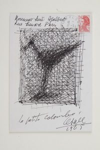 Dessin au stylo noir d’un oiseau en cage, légendé « La petite colombe », signé et daté 1985, avec l’adresse du destinataire.