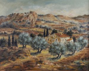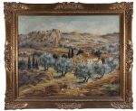 Felix TISOT (1909-1979) Garrigue Huile sur toile, signée en bas à droite, dédicacée, datée et contre-signée au dos sur le châssis. Hauteur : 65 cm - Largeur : 81 cm