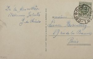 Giorgio de CHIRICO (1888-1978). Carte postale a.s., [Grimaldi 13-5-1928 ?], à Léonce Rosenberg ; au dos d’une carte postale illustrée en couleurs, avec adresse.