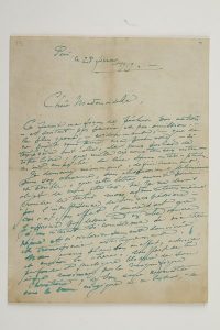 Minutes ou brouillons de lettres à des dames et des demoiselles, certains incomplets.{CR} Il remercie et félicite une demoiselle pour l’envoi de son « beau et poignant livre qui me fut en cette solitude, et au milieu des péripéties de cet aride labeur, rien moins qu’une manne céleste », qui l’a trouvé à Vernègues où il travaillait depuis plusieurs semaines à « ma grande statue destinée au Monument aux Morts de La Roque d’Anthéron », qu’il a terminée et moulée ici, seul et sans l’aide d’assistants, un « travail de forçat »…{CR} À une dame [la duchesse de Clermont-Tonnerre ?] qui lui avait demandé de faire son portrait. Il souhaiterait un décor digne d’elle mais n’a rien qui conviendrait dans son atelier : « J’ai à Bruxelles le plus considérable matériel d’atelier et assez bien d’objets précieux, qu’il est peu certain que je revoie jamais, sans parler de mes tableaux, marbres, bronzes, abandonnés à de problématiques sollicitudes ». Il se retrouve par conséquence à Paris « dans la condition d’un débutant ». Il la prie de ne lui passer aucune commande, ainsi que Mme de Brimont pour son portrait, et de ne pas fixer de prix : « la commande a toujours été pour moi un empoisonnement et l’obligation de réussir un portrait, […] une sorte d’entrave à ma liberté ». Il préfère faire les deux portraits d’abord pour lui, et s’il les réussit selon lui, les leur céder ensuite « au prix de guerre »… – Très malade, il la prévient du retard et qu’il a pris pour « le petit portrait commencé d’après vous » qu’il est en train terminer. Il s’excuse de lui avoir présenté un marchand « d’estampes et d’objets, truqués pour la plupart », escroc dont il se félicite de la disparition…{CR} À une amie : il est bien malade, et se retrouve « dégustateur morose d’un tas de drogues fallacieuses et débilitantes, qui semblent, comme dit Bloy, “vouloir ma peau”. […] toute ma maisonnée n’est d’ailleurs, en ce moment, qu’une sombre maladerie », et il n’arrive pas, dans ces conditions, à travailler… 15 janvier 1919 : « Dans l’immense et délectable solitude nocturne de mon atelier, combien m’est-il profondément joyeux de penser à vous »… Vernègues 4 décembre 1919. Lettre de recommandation à une dame en faveur de sa fille Marie-Thérèse, en voyage à Rome… {CR} On joint 1 L.A.S. de la baronne de Brimont à lui adressée, et 1 L.A.S. du Comité du Monument de La Roque d’Anthéron.