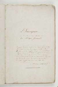 Important ensemble de l’œuvre littéraire du graveur.{CR} * Théâtre. L’Enfant du Siècle, drame en cinq actes et en vers, signé « Magnus de Lavurger » (anagramme de « Gusmand le graveur »), 2 juillet 1896 (195 p. obl. in-4) : l’intrigue a lieu en 1892, dans un milieu aristocratique ; le rideau se lève sur une fin d’orgie… L’Incomprise, comédie en cinq actes et en vers, signée « Adolphe Gusmand » (143 p. in-fol.) : la principale « incomprise » est l’épouse d’un bon bourgeois… Bernard Palissy, drame en trois actes et en vers, signé « Magnus de Lavurger » (62 p gr. in-fol., avec qqs corrections) : l’action se place à Saintes, vers 1550 ; l’émailleur ambitieux et orgueilleux est menacé de ruine… {CR} * Poèmes et compositions lyriques, parfois en 2 ou 3 versions. Le Secret du bachelier, romance moyen-âge, signature biffée remplacée par « Magnus de Lavurger », juin 1852 (2 manuscrits musicaux joints). Les Libres-penseurs, signé « Gandalus Thema » ou « Gandalus Thadeus », 1866 (2). Les Deux sœurs, apologue, 1866. Un papa à ses petits enfants. La bourse du Petit Jésus, conte, 1866. Judas le proxénète, apologue, 1866 (3). Le Gérant maladroit, apologue, 1866 (2). La Libre-pensée, épître à un ami, 1867 (3). Un bon conseiller, Tours 20 avril 1871. Cantique à Saint Martin, 1873 (copie jointe). À Lucifer, 1893, signé « Magnus de Lavurger » (3). À la Savoyarde, 1895. Le Voyage aérien (2)…{CR} On joint un portrait en pied photographique dédicacé à son fils Robert, 1900, un petit ensemble de vers manuscrits, et des imprimés : Aux hommes de bonne foi de tous les partis (1879 et 2e éd., 1880), quantité d’ex. de son poème Aux hommes de révolution ; plus divers documents.