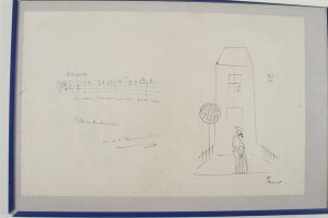 Un couple d’amoureux devant leur maison. Sur la page en regard, P.A.S. musicale de Claude Arrieu (1903-1990), 4 mesures Allegretto : « Monsieur, c’est une maladie que de vouloir »…