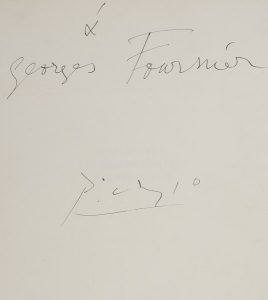 Dédicace sur la page de garde à l’encre noire : « à Georges Fournier Picasso ».{CR} L’ouvrage, comprenant une introduction et des poèmes d’Éluard, est illustré de nombreuses photographies et reproductions d’œuvres de Picasso.