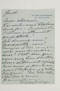 « J’ai voulu vous téléphoner deux fois – Impossible. C’est un instrument que je déteste ! Que devenez-vous ? Quand partez-vous ? Pourquoi n’êtes-vous plus venu nous demander à dîner ? C’est dire que vous avez bien d’autres choses autrement agréables. Moi aussi je pars ce soir pour l’Espagne, j’y resterai 7 ou 8 jours »…