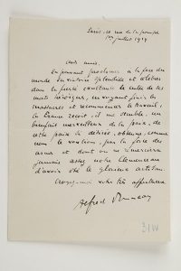 Bruxelles samedi matin [novembre 1891, au librettiste Louis Gallet], avant la représentation à Bruxelles de son opéra Le Rêve, d’après Émile Zola, prévue pour le 12 novembre au Théâtre de la Monnaie : « J’ai voulu attendre aujourd’hui pour vous dire le jour afin de voir si nous serions prêts et il est certain maintenant que nous passerons à cette date. Venez le plus tôt possible. On a décidé hier soir que la répétition générale aurait lieu aujourd’hui à midi afin d’avoir le moins de monde possible à cette répétition. C’est trop tôt, car nous ne sommes pas tout à fait au point. Mais vous en verrez d’autres et vos conseils nous sont indispensables. J’écris à Zola pour lui dire le jour de la première mais il ne viendra qu’à la dernière minute. Melle Chrétien [dans le rôle d’Angélique] est extrêmement curieuse et l’orchestre est très remarquable »... Paris 1er juillet 1919, à des amis : « En pouvant proclamer à la face du monde sa victoire splendide et célébrer dans la fierté exaltante le culte de ses morts héroïques, en voyant finir les massacres et recommencer le travail, la France reçoit, il me semble, un bienfait merveilleux de la paix, de cette paix si désirée, obtenue, comme nous le voulions, par la force des armes et dont on ne remerciera jamais assez notre Clemenceau d’avoir été le glorieux artisan »...{CR} À Gustave Charpentier. Vendredi : sa femme a été opérée la veille d’un abcès au genou, « cela s’est aussi bien passé que possible »... Paris dimanche. Il est heureux de le savoir officier de la Légion d’Honneur : « Je veux vous embrasser et vous dire combien je suis content »... On joint une carte de visite autographe avec enveloppe à E. de Romilly (1910).