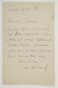16 juin 1883, au peintre Charles Jalabert. Il est désolé de n’être pas libre mercredi ; il s’est déjà engagé ailleurs : « Mille regrets, d’autant plus que je vais m’absenter pour près de trois mois »... 14 février 1891, à une dame, pour un rendez-vous chez lui « avec Madame votre fille »...