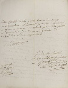 11 février. Il se recommande de l’Abbé de Brancas et intervient en faveur d’un de ses amis, « creancier du gendre de feu M. Bouet negociant à Avignon et cy devant à Marseille ainsy qu’a la foire de Bocaire ; ayés s’il vous plait la charité de remettre les papiers à un procureur à l’effet de faire opposition à la levée des scellés et autres actes judiciaires en semblable occasion. Nous nous flattons mon ami et moy que vous voudrés bien Monsieur, nous faire cette grace […]. Notre famille désolée par la rigueur des temps vous reconnoitra Monsieur pour son liberateur »… Il signe : « L. Homet me de musique de l’Eglise de Paris ». – 20 mai. Il a rendu visite à son ami et à sa famille, « pour lesquels vous avés la charité de vous interresser, je leur ay demandé de nouveaux eclaircissements […] Fontaine qui est de mes amis, est creancier de Rousse, le quel Rousse est gendre de feu Bouet, ayant épousé sa fille à Marseille ; Rousse est commun en bien avec sa femme, et Fontaine espere par ce moyen pouvoir exercer les creances contre le dit Rousse ; ce Rousse est à Paris ordinairement et assés mal arrangé dans les affaires. Fontaine qui ne peut rien esperer a cru pouvoir mettre opposition à la levée des scellés contant que Rousse à qui l’on a ecrit d’Avignon de se rendre en cette ville pour recueillir la succession de feu Bouet, consentiroit par ce moyen que Fontaine fut payé »…