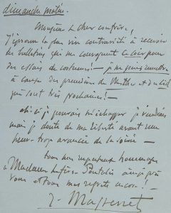 25 décembre 1892, déclinant une invitation, car il doit rester près de sa femme souffrante à l’heure des repas : « Je suis pris toute la journée au théâtre – je n’ai que cet instant pour être réunis »… [8 janvier 1893]. Il est convoqué ce soir « pour des essais de costumes ! Je ne puis remettre à cause des productions de Werther et du Cid qui sont très prochaines ! Ah ! si je pouvais m’échapper je viendrais mais je doute de ma liberté avant une heure trop avancée de la soirée »… Lyon 13 février 1893. Il est à Lyon pour les répétitions générales de Werther au Grand Théâtre. Il ne pourra se rendre à son invitation, ayant déjà fait remettre les représentations de Nantes « où l’on m’attend depuis un mois »… Etc. On joint 2 cartes de visite autographes par E Paladilhe et Camille Saint-Saëns.
