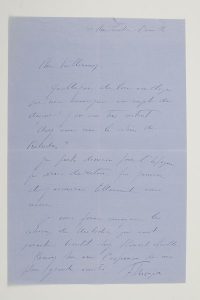 « Quelle joie de lire vos éloges sur ma musique au sujet du disque ! J’en suis très content. Avez-vous reçu le cahier de Préludes ? Je pars demain pour l’Espagne je serais de retour fin janvier et j’aimerais tellement vous revoir. Je vous ferais envoyer les cahiers de Mélodies qui vont paraître bientôt chez Rouart Lerolle »…{CR} On joint un portrait photographique de Joaquin Nin, avec dédicace a.s. à Violette Gath.
