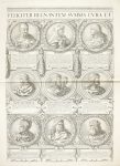 papas desde San Pedro hasta Innocencio XII. En la última plancha gran friso presidido por un escudo cardenalicio con seis estrellas de ocho puntas. siguen dos retratos de Clemente XI que no pertenecen a la misma obra pero sí del mismo grabador. Sigue una plancha con un friso decorativo en el que tres angelotes portan la mitra papal, las llaves del cielo y unas filacterias, a su lado una cartela. [Sigue:] .EFFIGIES ROMANORUM IMPERATORUM EX ANTIQUIS NUMISMATIBUS. QUAE IN THESAURO CHRISTINAE REGINAE ADSERVANTUR DELINEATAE, IN SERIEM CHRONOLOGICAM DISPOSITAE, CUM NOMINIBUS... .Consta de 14 planchas con los retratos de cada uno de los emperadores romanos, realizados a partir de las imágenes de las monedas. Al final de la última plancha un friso con texto presidido por un águila que sostiene entre las garras el texto donde al final reza: Romae, 1681, grabados realizados por Iacobi de Rubeis y Petro Aquila. [Sigue:] .SERIES CHRONOLOGICA ET IMAGINES REGU[M] HISPANIAE AB ATAULPHO AD CAROLUM II... .10 planchas. En las dos últimas con un gran friso decorado con el texto grabado en plancha donde figura la fecha de 1685. Esta cronología de los reyes de España fue costeada por el virrey de Nápoles Gaspar de Haro y Guzmán (como consta al final de la obra), los dibujos realizados por el pintor Ciro Ferri y grabados por Jacques Blondeau. La confección de esta cronología pone de relieve la importancia que la monarquía daba a su continuidad ininterrumpida. Impreso sobre papel grueso, de excelente calidad. Exlibris del marqués de Monteynard. Tres obras enc. en un volumen, encuadernado en plena piel, con nervios, lomera cuajada. Algunas rozaduras en los planos. Tres obras monumentales que recogen grabados calcográficos por Iacobi Rubeis; cada una de ellas es poco frecuente en comercio, las tres juntas extraordinariamente raro.
