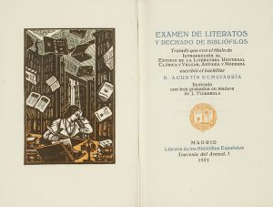 .1921.. LIBRO: .(COLECCIÓN BIBLIÓFILO).. .ECHAVARRÍA, AGUSTÍN:. .EXAMEN DE LITERATOS Y DECHADO DE BIBLIÓFILOS.. Madrid: Librería de los Bibliófilos españoles, 1921. 12º. 3 h. + 75 p. + 2 h. + 3 grabados en madera de J. Figuerola. Preciosa...