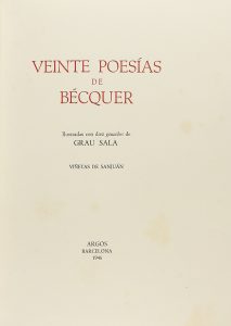 .1946.. LIBRO: .(BIBLIOFILIA).. .BECQUER, y GRAU SALA [ilustr.]:. .20 POESÍAS DE BÉCQUER.. Barcelona: Ed. Argos, 1946. 4º mayor. 163 p. Ilustr. con reproducciones de 10 gouaches de GRAU SALA y viñetas de SANJUAN. Edición numerada de 400...