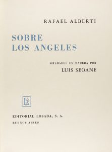 .1962.. LIBRO: .(LITERATURA-ILUSTR.).. .ALBERTI, RAFAEL; SEOANE, LUIS:. .SOBRE LOS ÁNGELES. Grabados en madera por Luis Seoane.. Buenos Aires: Editorial Losada, 1962. Folio mayor. 65 p. + 3 h. Enc. original en cartoné con sobrecubierta ilustrada,...