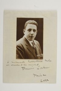 Portrait de Poulenc par Joseph Rosmand (Paris), au-dessous duquel Poulenc a inscrit la dédicace pour la claveciniste italienne : « à Mademoiselle Corradina Mola avec admiration et très amicalement Francis Poulenc Venise 1932 ».{CR} [Amboise]. « Mon vieux. La Touraine seule m’a empêché de venir chez toi – je travaille au calme. […] Que cette amoureuse grenouille te porte mes fidèles amitiés ». – [Noizay]. « Hélas, le 23, je serai en Italie ! J’aurais tant aimé te voir, superbe avec ton chapeau haut de forme !! Sois un beau-père digne et sérieux »…
