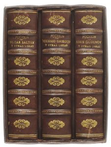OBRAS. 315 p. + 1 h. III: BORIS GODUNOV Y OTRAS OBRAS. 297 p. + 1 h. Mínimas rozaduras. Exquisita enc. en plena piel con motivos pintados, con decoraciones distintas en cada vol., lomera con dorados, nervios, cortes dorados; presentada en petaca con separadores de piel; conserva las cubiertas originales.