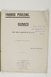 Sonate pour deux clarinettes (J. & W. Chester, 1919), dédicacée à l’encre bleue sur le titre : « Pour mon vieux petit Lelong, bien, bien affectueusement. Francis ». – Le Bestiaire ou Cortège d’Orphée. Poèmes de Guillaume Apollinaire (Éditions Max Eschig), dédicacé : « Au Docteur Ferrand avec mon très affectueux souvenir. Poulenc, Marrakech mars 51 ». {CR} On joint un dessin à l’encre noire représentant Poulenc au piano de profil (27 x 21 cm) ; plus diverses partitions de musique, une manuscrite, 3 dédicacées par G. Collin, et une par A. Barbirolli.