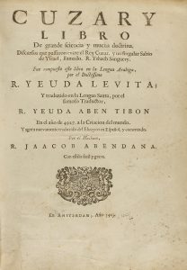 5423 (1633 d.C.). 4º menor. 4 h. + 306 p. Algún subrayado antiguo. Enc. en pergamino de época. El texto original hebreo de esta obra no se llegó a imprimir, la primera impresión de este texto es la traducción latina. Escrito con forma de diálogo platónico, entre el rey y el sabio Yshach Sangueri; el rey se había convertido al judaísmo y el sabio musulmán le interpela. La obra pronto se convirtió en un clásico de apologética judía y un paradigma de imparcialidad cuando presenta la fe cristiana y musulmana, un ejemplo de la tolerancia religiosa medieval española. Presentamos aquí la PRIMERA TRADUCCIÓN al castellano desde el hebreo. Edición muy rara, circunstancia ya comentada por Palau 66664. Brunet II, 319.