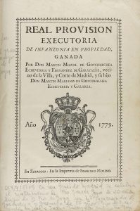 .1779.. LIBRO: .(EJECUTORIA).. .REAL PROVISIONAL EXECUTORIA DE INFANZONIA EN PROPIEDAD, GANADA POR DON MARTIN MIGUEL DE GOYCOHECHEA EVHEVERRIA Y FERNANDEZ DE GARAYALDE, Y VECINO DE LA VILLA, Y CORTE DE MADRID, Y SU HIJO DON MARTIN MARIANO DE...