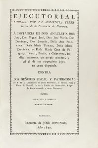 .1820.. LIBRO: .(EJECUTORIA-NAVARRA).. .EJECUTORIAL LIBRADO POR LA AUDIENCIA TERRITORIAL DE LA PROVINCIA DE NAVARRA. Á INSTANCIA DE DON ANACLETO, DON JOSÉ, DON MIGUEL JOSÉ... DE FAGOAGA, DUTARI, BORDA, Y GALAYNENA, LOS DIEZ HERMANOS, EN PROPIO...