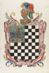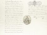 NOMBRE, Y EN EL DE SUS RESPECTIVOS HIJOS, EN CAUSA DISPUTADA. CONTRA LOS SEÑORES FISCAL Y PTATRIMONIA DE S. M. LA DIPUTACION DE DICHA PROVINCIA, LA HEROICA VILLA Y CORTE DE MADRID, LA DE LA PUEBLA DE ALMORADIEL, LUGAR DE ZUGARRAMURDI, Y OTROS CONSORTES. SOBRE HIDALGUÍA Y NOBLEZA.. Pamplona: Imp. José Domingo, 1820. Folio menor. 2 h. + gran escudo heráldico realizado a mano sobre papel avitelado + 93 p. en orla xilográfica y 19 h. manuscritas sobre papel sellado. Lleva sellos en tinta de Fernando VII y sellos en seco. Al final del texto impreso firmas manuscritas del Regente y algunos magistrados de la Audiencia, sellada con el sello mayor de la Chancillería y firma del escribano de la ciudad de Pamplona. Preciosa enc. de principios del s. XIX sobre vitela roja, decoraciones en hierros dorados en ambos planos, cantos y cejas, en las puntas cuadrados marrones en piel con detalles en hierros secos, lomera cuajada, guardas de seda. La encuadernación va preservada en una petaca de pasta española con ruedas doradas. Anacleto de Fagoaga y Durati desarrolló su carrera diplomática en la segunda mitad del s. XIX, en 1821 se le concedió la gracia de caballero de la Real y Distinguida Orden de Carlos III. Era hermano de Joaquín, Miguel José, Domingo y de José María de Fagoaga y Dutari los cuales, junto con sus hermanas Ana Francisca, Mª Tomasa, Mª Dominica y Mª Cruz, obtuvieron libranza de nobleza e hidalguía por la Audiencia Territorial de Pamplona dada en la prensa en 1820, este es el documento.