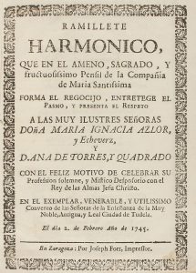 .1745.. FOLLETO: .(RELIGIÓN-LITERATURA).. .AZLOR, MARIA IGNACIA y TORRES Y QUADRADO, ANA DE:. .RAMITLLETE HARMONICO QUE EN EL AMENO, SAGRADO, Y FRUSTUOSISIMO PENSIL DE LA COMPAÑÍA DE MARIA SANTISIMA FORMA EL REGOCIJO, ENTRETEGE EL PASMO, Y...