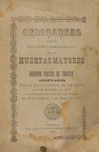 .1903.. FOLLETO: .(NAVARRA-DERECHO).. .ORDENANZAS PARA EL BUEN ÓRDEN ADMINISTRATIVO DE LAS HUERTAS MAYORES Y CAMPOS UNIDOS DE TUDELA ADOPTADAS POR LA JUNTA GENERAL DE REGANTES EN 8 DE SEPTIEMBRE DE 1877.. Tudela: Imp. Julio Subirán, 1903. 4º...