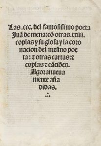 .1512.. LIBRO: .(GÓTICO).. .MENA, JUAN DE:. .LAS CCC DEL FAMOSISSIMO POETA... CO[N] OTRAS XXIII COPLAS Y SU GLOSA Y LA CORONACION DEL MESMO POETA. OTRAS CARTAS. COPAS Y CA[N]CIO[N]ES. AGORA NUEVAMENTE AÑADIDAS.. Sevilla: Jacobo Cronberger, ocho...