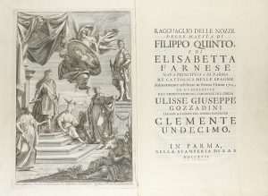 A. S., 1717. Folio menor. Gran frontis alegórico grabado + 115 p. + 5 grandes láminas grabadas, plegadas. Enc. en pasta española, nervios, lomera decorada con flores de lis doradas, cortes jaspeados. Grandes márgenes, recio y grueso papel. Las láminas fueron grabadas por Teodoro Verecruise y F.M. Francia Bonom y representan: el gran desfile que supuso la entrada en la ciudad de los invitados y el monarca, la fachada del Duomo de Parma, el interior del de la catedral, el coro con todos los personajes y finalmente la planta de la catedral de Parma. Edición bellísima y en buen estado de conservación. Palau 246192.