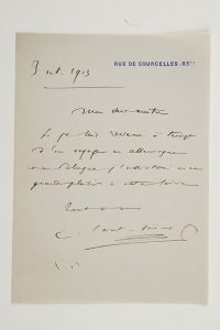 3 octobre 1913, à un « cher maître ». Il accepte avec « grand plaisir » de prendre part à la soirée à laquelle son correspondant l’a convié, s’il revient à temps de son voyage en Allemagne et en Pologne… [À la cantatrice Marie Brousse]. Il a bien reçu sa lettre, « mais le désir de vous entendre le plus tôt possible est cause que j’avais mal lu et mal compris. À lundi 22 puisqu’il n’y a pas moyen de vous avoir plus tôt »… On joint une L.A.S. de sa mère (1883) au bas d’une lettre imprimée : Monsieur Saint-Saëns étant en voyage pour raison de santé ne peut répondre à aucune des lettres qui lui sont adressées.