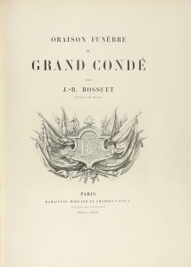 .1879.. LIBRO: .(HISTORIA).. .BOSSUET, J.- B.:. .ORASION FUNÈBRE DU GRAND CONDÉ.. Paris: Damascène Morgand et Charles Fatout, 1879. Folio mayor. Portadilla + portada + 2 h. + 52 p. y colofón. Con un retrato, 3 aguafuertes a toda plana, 2 viñetas...