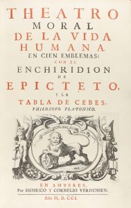 .1701.. LIBRO: .(HUMANIDADES).. .[VENIO, OTTO:].. .THEATRO MORAL DE LA VIDA HUMANA EN CIEN EMBLEMAS; CON EL ENCHIRIDION DE EPICTETO, Y LA TABLA DE CEBES, PHILOSOFO PLATONICO.. Amberes: Henrico y Cornelio Verdussen, 1701. Folio. 10 h. + 207 p. + 27 p....