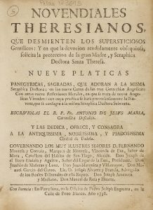 .1738.. LIBRO: .(RELIGIÓN).. .JESÚS MARIA, ANTONIO DE:. .NOVENDIALES THERESIANOS, QUE DESMIENTEN LOS SUPERSTICIOSOS GENTILICOS: Y EN QUE LA DEVOCION RENDIDAMENTE OBSEQUIOSA, SOLICITA LA PROTECCION DE LA GRAN MADRE, Y SERAPHICA DOCTORA SANTA...